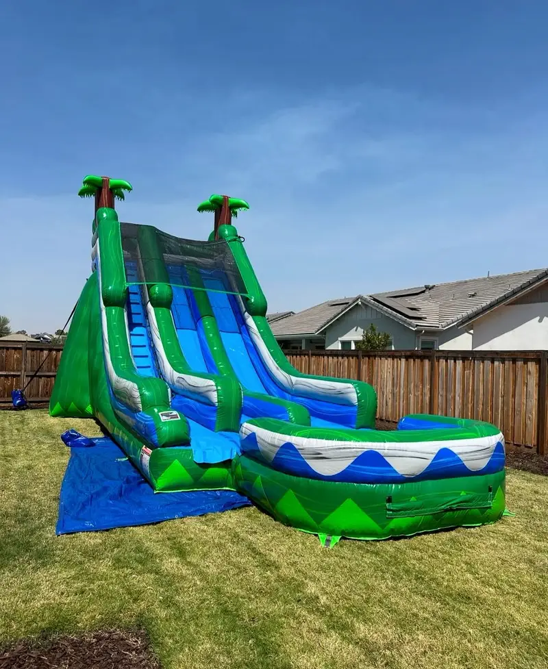Turn your backyard into a tropical paradise with the Tropical Rush™ Green Palm Waterslide! This vibrant, palm tree-themed inflatable slide is perfect for sunny days, pool parties, and non-stop summer fun. With its lush green design, towering inflatable palms, and refreshing built-in water sprayer, kids and teens alike will feel like they’re sliding straight through a jungle oasis.