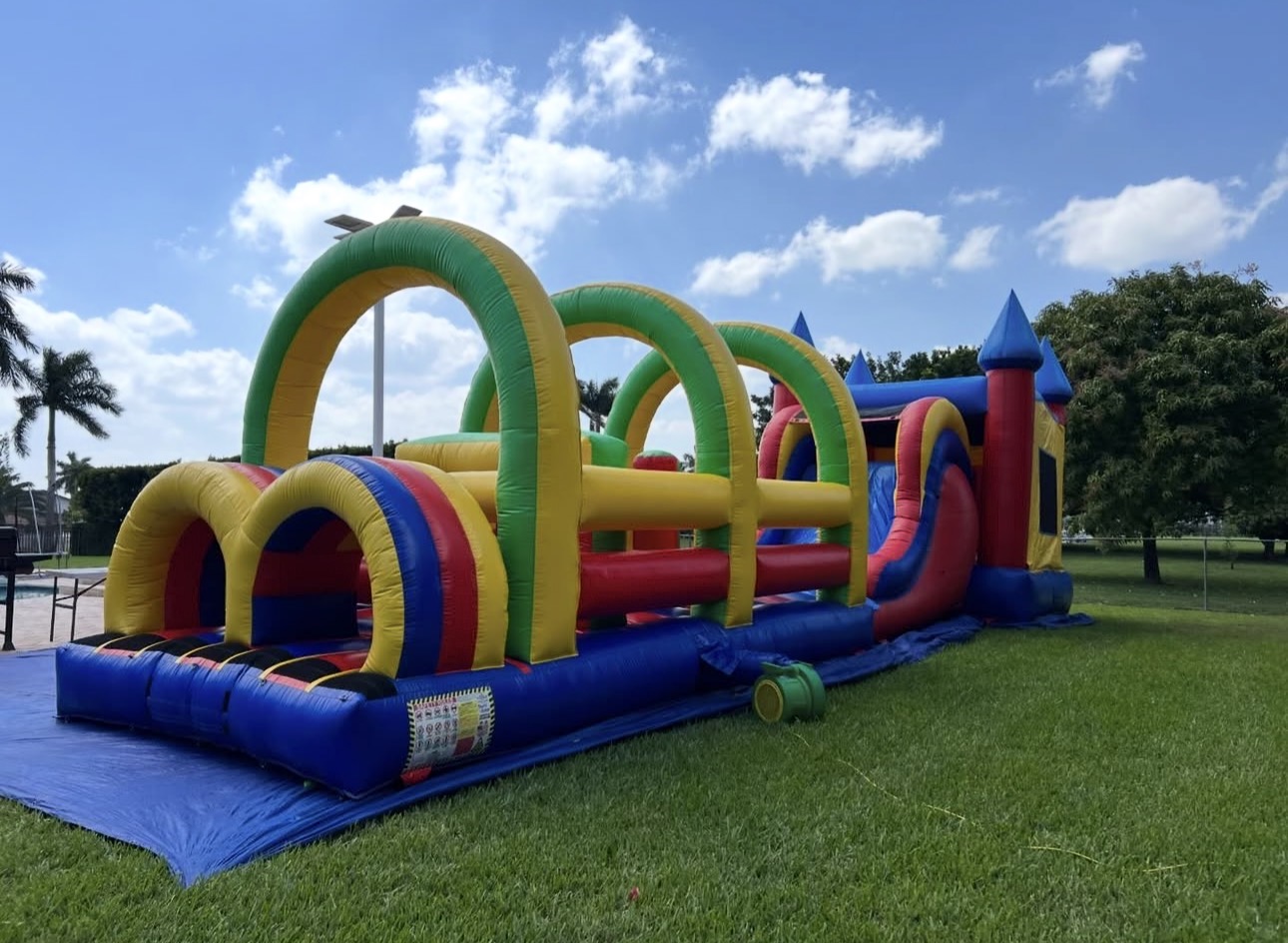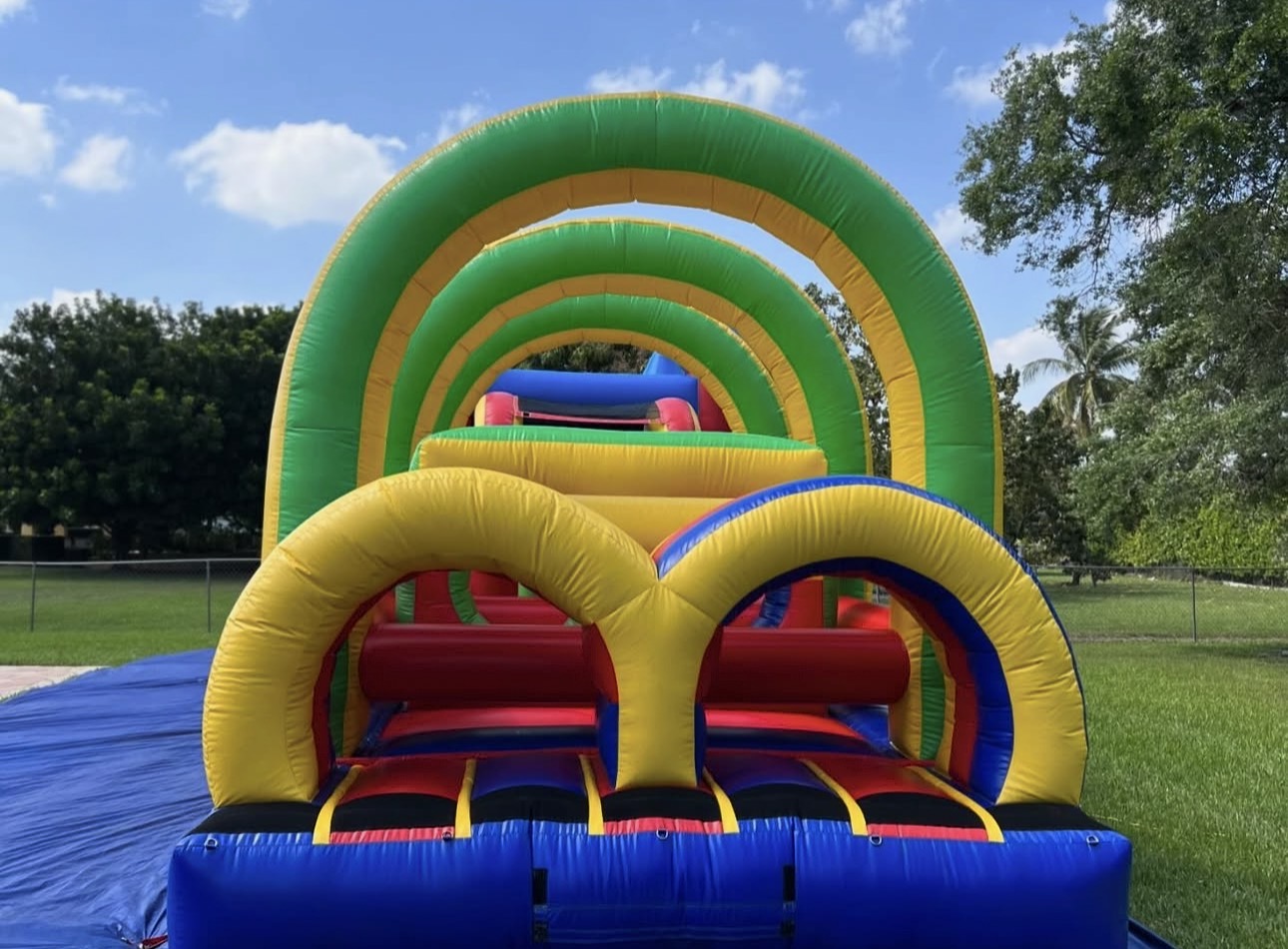 Unleash adventure at your event with our thrilling Castle Obstacle Course Combo! This dynamic inflatable features a majestic blue castle entrance with tall, pointed turrets in red and yellow, leading into a vibrant, multi-color challenge zone. Kids navigate through a series of arching tunnels in green, yellow, and red, crawl over soft padded obstacles, and climb up colorful walls before zooming down a steep red slide back to the start. The entire structure sits on a sturdy blue base, blending bouncing fun with action-packed obstacles for endless excitement. Set against lush green grass under a clear blue sky, it’s ideal for birthdays, school events, or backyard bashes, promoting active play and teamwork for ages 3 and up.