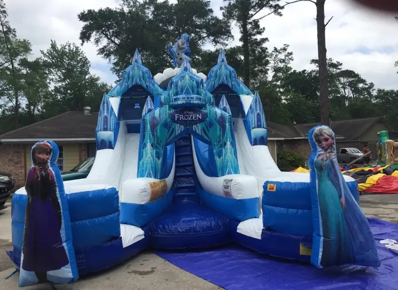The newest addition to the 909 Jumpers water slide line up is the Frozen Beach waterslide. Why Glitter? Look closely at the Frozen animation and turquoise vinyl colors to see the glitter shining in the vinyl. Even the rainbow above the waterslide has glitter in the vinyl.
